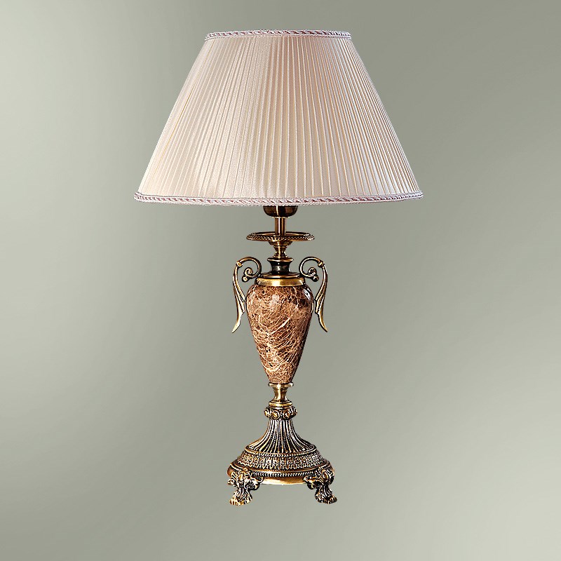 Настольная лампа с элементами из натурального камня найдет себе место как в гостинной так и в кабинете на Вашем рабочем столе.Смягчая контуры обстановки и создавая замечательную игру светотени данная модель станет украшением Вашей спальни. Основание лампы изготовлено из металла с декоративным покрытием под античную бронзу, абажур изготовлен из текстильной ленты, выключатель расположен на шнуре с вилкой.