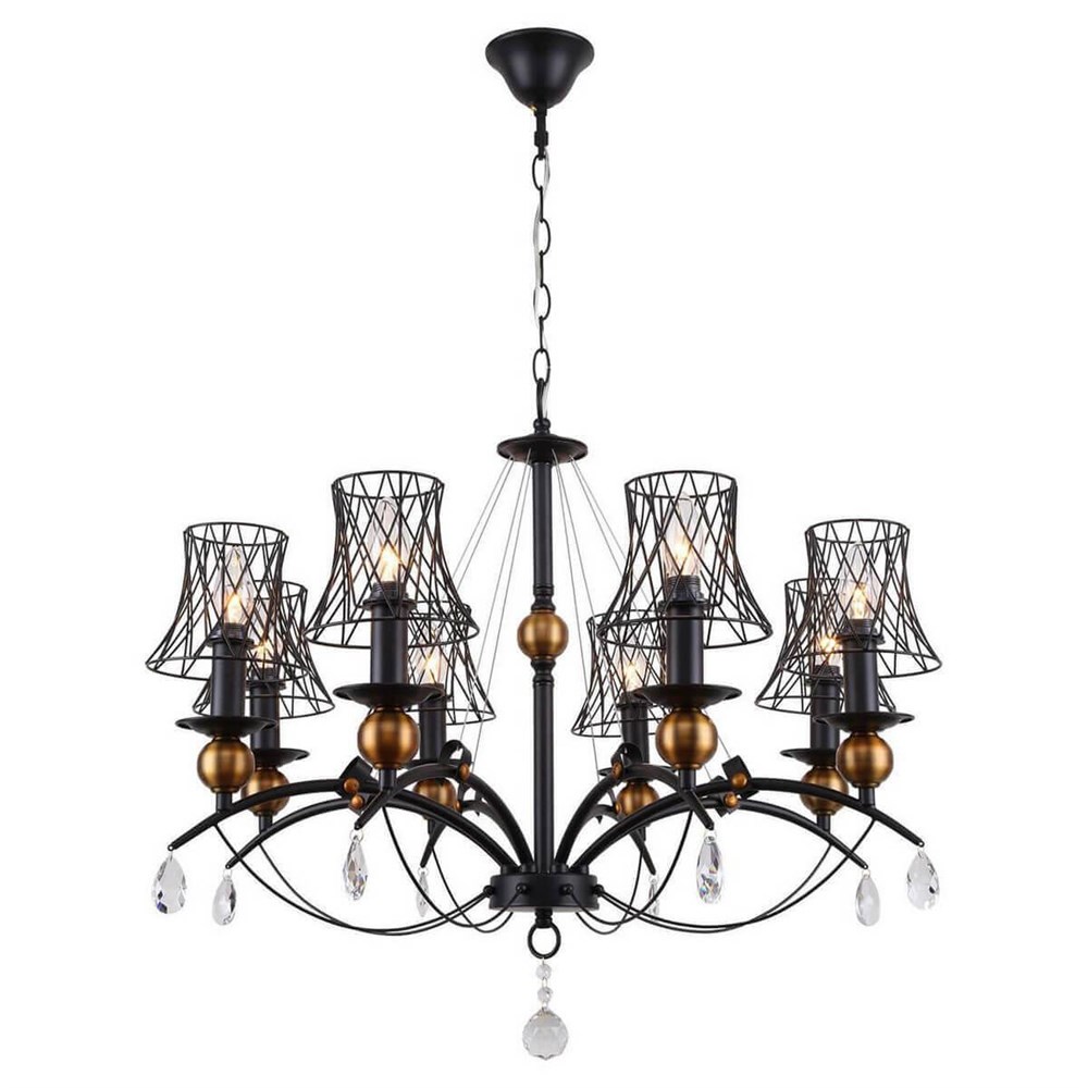 Объемная металлическая черная люстра с подвесками под плафонами и центром будет приковывать внимание гостей. Сетчатые плафоны внутри со свечой погрузят Вас в замковую эпоху. Серия состоит из пятирожковой и восьмирожковой люстры а также не менее привлекательной бра.\