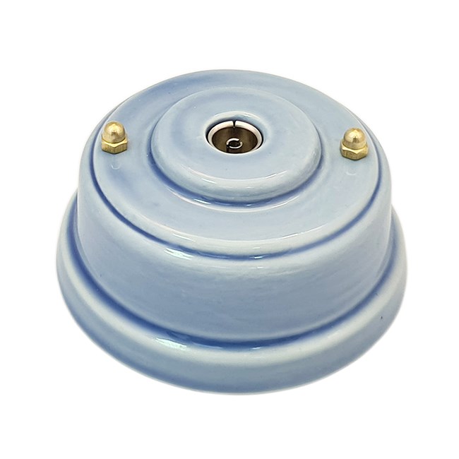 Бытовая телевизионная розетка оконченная с фарфоровым корпусом голубого цвета, предназначенная для монтажа открытым способом (наружного монтажа), с одним техническим отверстием для входа коаксиального кабеля.